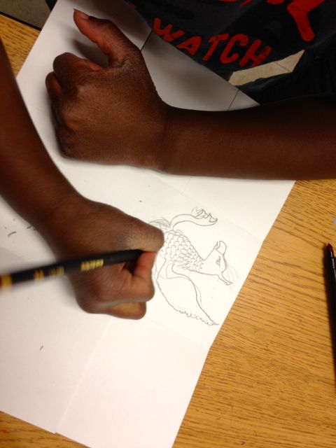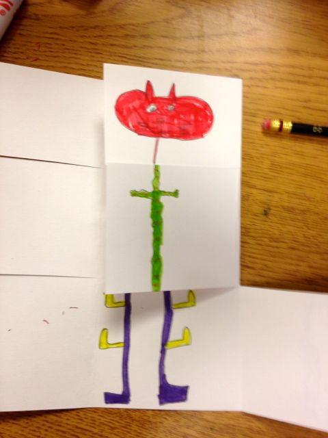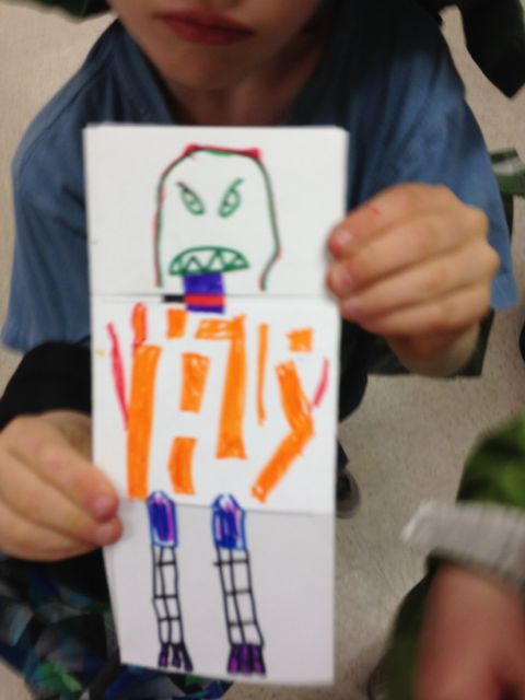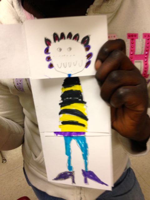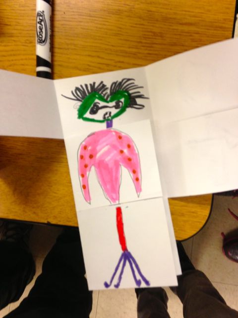 There are very few projects that are more fun than an exquisite corpse book. For one thing, it’s a group project with lots of collaboration. The process creates a lot of surprises as well. I have a “tops and bottoms” one I’ll be unveiling at the National Children and Youth Garden Symposium in Denver in July, but for sheer fun, monsters it is. These were done by Hawthorne Elementary School students in Seattle yesterday. I’m teaching enrichment classes at Hawthorne and Beacon Hill Elementary as part of Powerful Schools (powerfulschools.org).