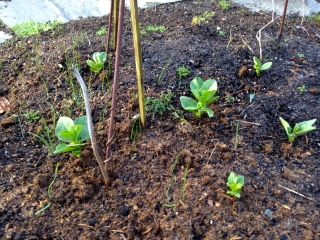 Right now I am celebrating spring by working on a curriculum guide that will tie Our School Garden! to the Common Core. Look for that soon! I am also celebrating spring by planting my own garden and by watching some of my winter vegetables start to go to seed–a great time to frizzle them up in some olive oil! My fava is now sprouting (see photo) and I look forward to having the leaves (prepare like spinach!) and then the fresh beans right about the beginning of summer. My rhubarb is up now, too. It’s almost pie time!