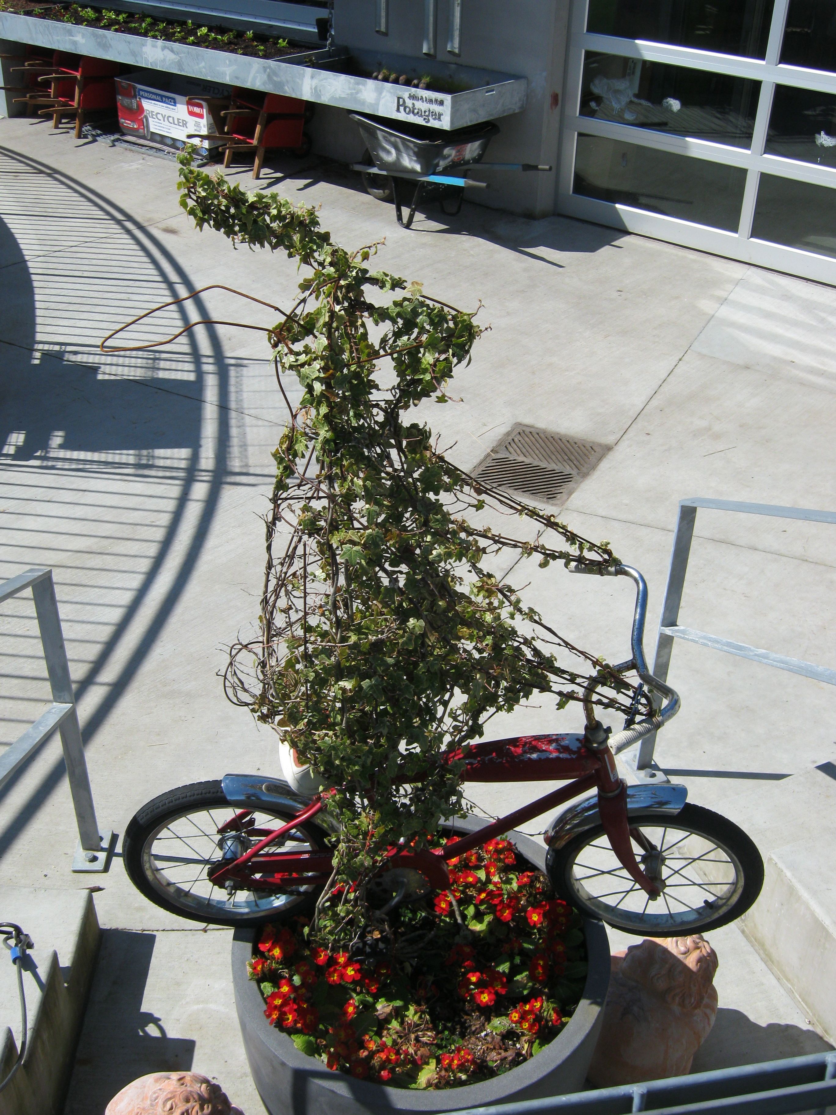 I’ve been lucky enough to visit many school and community gardens this past year. I have to admit that while all of them were functional, the gardens that have added art or other features have a way of standing out. They really invite you to spend time in them and to just hang out and enjoy the spaces they create. I’ve seen sculpture, topiary, outdoor ovens, and structures for vines to climb up creating enclosed spaces and loved them all.