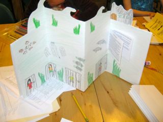 I just finished teaching a four week class at 826 Seattle, a wonderful writing and tutoring organization for kids. The class was called Dragons and Castles and Art Books, Oh My! It was a combination book making and writing class that lasted for four Saturday sessions. Participants each created a fantasy world. But not only did everyone write descriptions of these worlds, s/he each made a “scape” book that illustrated the world s/he created: a giant accordion-style book with a shaped top that was cut out of single sheets of large paper. There was a wide variety of worlds represented, with mountain ranges, forests and giant lollipops sticking up from the top of our books, and castles and other buildings popping out from them, and all of them illustrated in great detail.